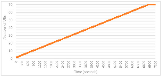 Several nodes representing UEs can then be placed randomly on a preconfigured square/rectangle area. Once the total number of nodes in the simulation is defined, it is possible to add all the nodes either during the simulation launch or gradually according to preconfigured time intervals. In our simulations, we opted for the second method and added a new UE every 100 s, as illustrated in Figure 13. This strategy of linearly adding users seems to well suit the reality of the disaster scenario where rescue teams should join the disaster area gradually. This allows us to better observe the evolution of the group as well as the many parameters related to the connectivity levels, the average CQI, and the number of topology updates.