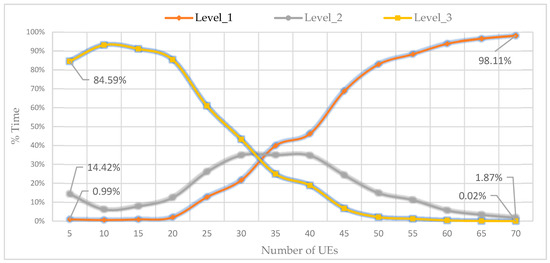 During these simulations, a verification is processed every second to count the time duration corresponding to every formed group’s connectivity type. For better presentation, we express the resulting time as a percentage of the total simulation time duration. From Figure 15, it is possible to conclude that with fewer than 20 UEs (80 UEs/km2), the probability of having a single group (or even two) is very low. With 50 UEs (200 UEs/km2), the probability of having level_3 becomes very minimal. As soon as 70 users (280 users/km2) are reached, the uniqueness (level_1) of the group is confirmed, and the decomposition of this group occurs for less than 2% of the total time, i.e., up to 2 to 3 min every 2 h.