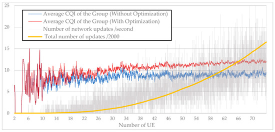 Using the simulation values presented in Table 1, the “Less cost” and “optimized tree” approaches are implemented, as explained in Section 4. While the “less cost” approach focuses on keeping minimum change in the network structure, the “optimized tree” approach allows each node to check in its neighbors for a better CQI. Simulations are conducted to estimate how costly keeping an optimized topology could be in terms of link substitutions. Figure 16 illustrates the gap between the two approaches, which becomes more considerable once the number of users reaches 20. Starting at 30 users, the gap begins to stabilize around 2 to 3 points on the CQI scale. The CQI value represents the average value of all established direct communication links in the network. To the same graph, the total incremental number of updates (divided by 2000 for better visibility) as well as the periodic number of updates per second were added. We notice that their value increases exponentially while the number of added users is in a linear progression. With 70 UEs, it takes up to 25 operations per second to keep the network optimized. During 2 h of simulation, more than 32,000 substitution operations were performed.