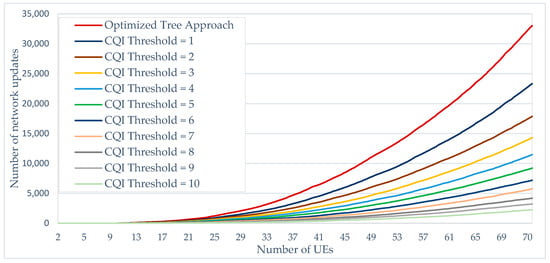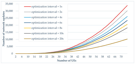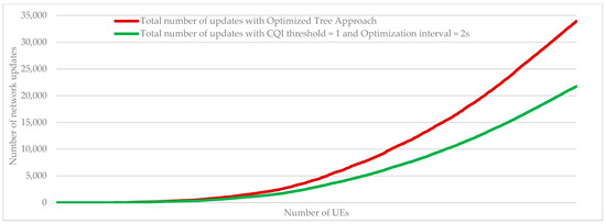 To reduce the number of network updates, a set of simulations is achieved by increasing the optimization interval while the CQI threshold is fixed at 0. Instead of performing the optimization every second, different values of the optimization interval (2, 4, 6, 8, 10, and 20 s) were simulated. Compared with the “optimized tree”, where optimization is carried out every second, we note from Figure 20, that using an interval of 2 s can reduce the number of network updates by almost 10% when the number of UEs is equal to 70. We also note that, with the variation in the optimization interval, the gap between network updates becomes significant starting at 40 UEs. Moreover, as the number of UEs increases, the reduction in network updates becomes more important.