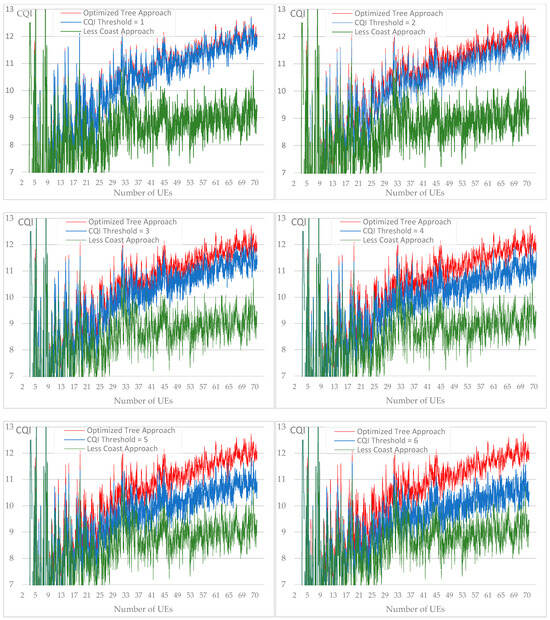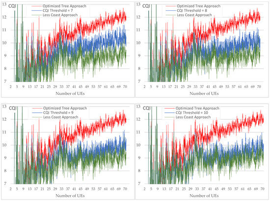A set of simulations was carried out to verify the effect that the variation in the CQI threshold can have on the average CQI of the network. Several CQI thresholds were used during the simulations, ranging from 0 (for the optimized approach, as illustrated in Figure 18) to 10. For a better visual comparison, Figure 19 includes the CQI average chart for each CQI threshold value, while the line chart of the two reference approaches, i.e., “optimized tree” and “less cost”, are maintained for better comparison.