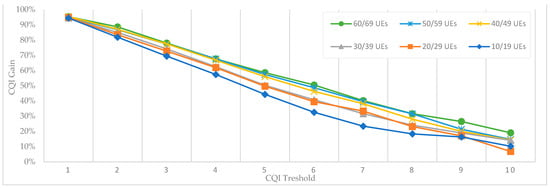 Average CQI gains according to the number of UEs and CQI threshold values.