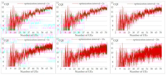 Using the same values of the optimization interval, a set of simulations was carried out to verify the effect on the average CQI of the network. In Figure 21, different graphs corresponding to each selected optimization interval value are presented. We notice that the shape of the graph lines in the upper part is almost close to those of the “optimized network” approach. However, the difference widens in the lower values of the graph, and we notice that the values of the average CQI drop once the optimization interval increases.