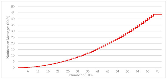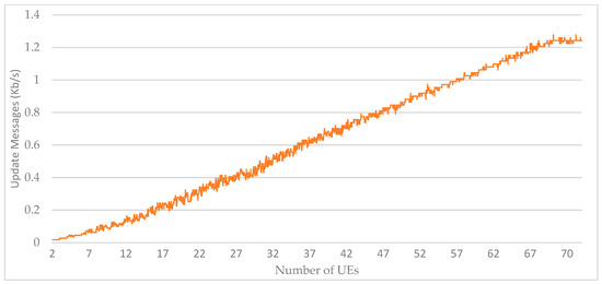 Simulations were carried out to measure the traffic generated by network control messages exchanged between UEs and the Application Server by keeping the same parameters used in the simulation experiments presented in Table 1. Figure 24 illustrates the traffic generated by notification messages sent by UEs to the server. The resulting outbound traffic increases rapidly and non-linearly with the progression of active UEs. However, the consumed bandwidth from the server side remains relatively very low (less than 45 Kb/s for 70 UEs) compared with the data rates offered by cellular technologies (LTE and 5G), which are generally measured in tens or even hundreds of Mb/s. At the same time, we notice slight repetitive peaks in the curves, which are due to the notification messages sent by the server when a new user is added. The inbound traffic supported by the server is generated by update messages sent from UEs, as illustrated in Figure 25. We note that this traffic is almost proportional to the number of UEs, and it remains relatively very low (less than 1.3 Kb/s for 70 UEs); therefore, we can conclude that it will be easily supported by the server.
