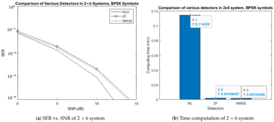 Furthermore, the evaluation was extended to scenarios where the MIMO system possesses different numbers of transmitters and receivers. Similar to the previous case, Table 4 and Figure 3 present the SER and computational time results for MLD, MMSE, and ZF. The findings reiterate the trend observed previously, with MLD achieving lower SER but incurring higher computational costs.