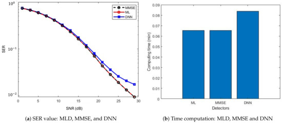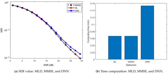 The DNN architecture consists of seven hidden layers, each with 100 neurons. The ReLU activation function is used for the hidden layers. The model was trained for 1000 epochs. The simulation results depicted in Figure 4 demonstrate that the DNN outperforms the traditional approaches (MMSE and MLD) and exhibits performance reasonably close to theirs. Additionally, the computational time of the DNN was compared to that of the conventional methods. The findings revealed that the DNN requires a longer processing time compared to MMSE and MLE.