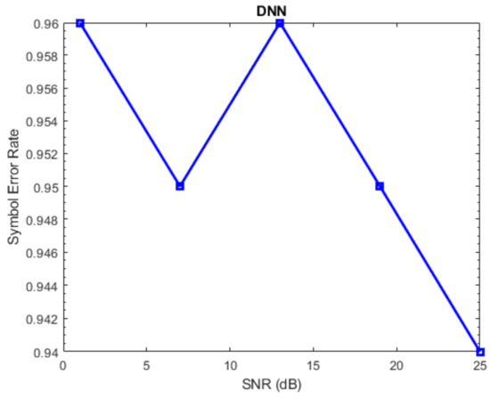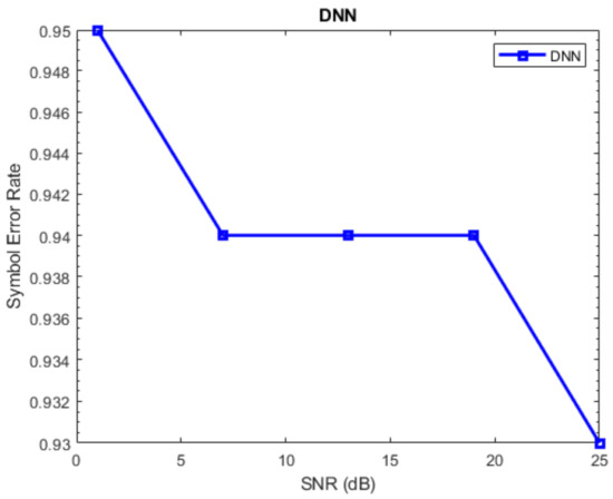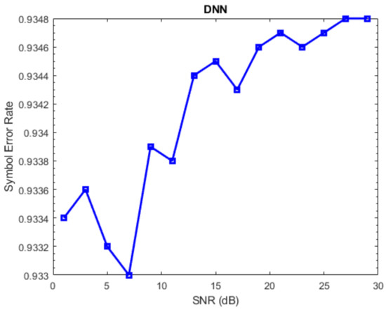 The initial MIMO-based DNN configuration consisted of 10 hidden layers, each containing 80 neurons. The model was trained over 2000 epochs using a dataset of 10,000 samples from both the training and testing sets. However, as shown in Figure 8, this configuration did not yield significant improvements in the DNN’s performance, as evidenced by the increasing SER values across all SNRs.