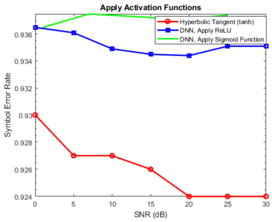 The results, depicted in Figure 10, demonstrate that the sigmoid function yielded the lowest SER across all SNR levels compared to the ReLU and tanh functions. This suggests that the sigmoid function introduced a more suitable level of non-linearity for this specific MIMO detection task.