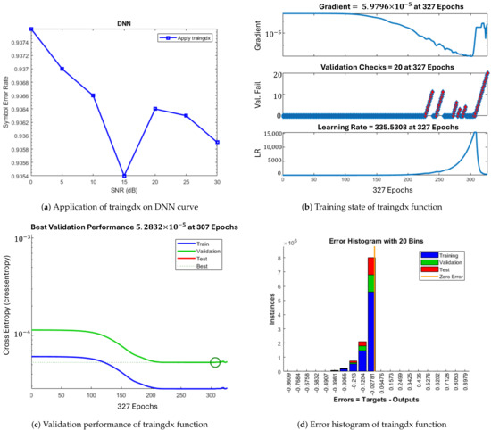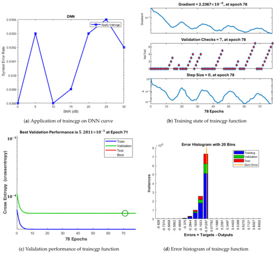 Figure 11 presents the performance of the traincgp function. The SER values increased across all SNR levels, indicating a rise in errors. Conversely, the training state (Figure 11b) reached a very low gradient (2.2367 ) and stopped early at epoch 78, suggesting potential underfitting. The validation performance (Figure 11c) also confirms this, with the best validation performance being relatively high (5.2811 ). The error histogram (Figure 11d) depicts the distribution of errors across different ranges.