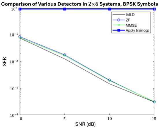 The performance of a DNN-based MIMO detection model was evaluated and compared to conventional methods (MLD, MMSE, and ZF) using SER as a metric. While the DNN explored various training functions, the conventional methods consistently outperformed the DNN in terms of SER. This discrepancy can be attributed to the DNN model’s sensitivity to training data and its inability to generalize well across different signal conditions. Additionally, the high complexity and inter-antenna interference in MIMO systems pose significant challenges for the DNN. As shown in Figure 13, the MIMO-based DNN functions were consistently outperformed by the conventional techniques, particularly at higher SNR levels. This highlights the continued effectiveness and stability of conventional methods for signal detection tasks in complex MIMO communication systems.