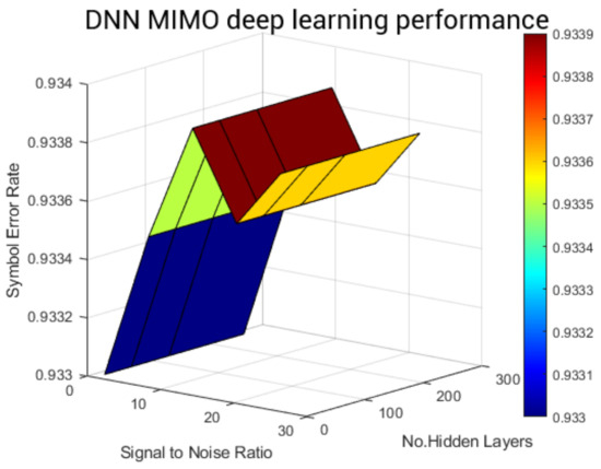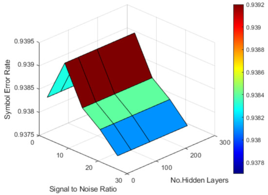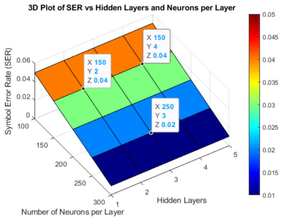 These 3D plots reveal intricate relationships between the number of hidden layers, the number of neurons per layer, and the resulting SER performance at varying SNR levels. It is important to acknowledge that, within the DNN architecture, several parameters are interconnected and exert a mutual influence. These parameters encompass the number of antennas employed in the MIMO system, the SNR itself, and system performance metrics like SER [22]. By visualizing these factors in three dimensions, we can achieve a more comprehensive understanding of how they interact with each other. This visualization serves as a valuable tool for optimizing system parameters, developing algorithms, and making informed decisions to improve the performance of the designed DNN, as shown in Figure 16.