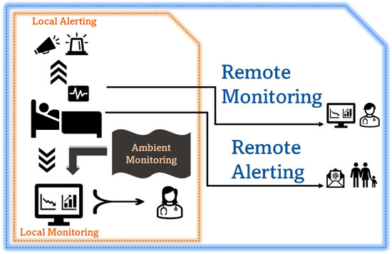 The proposed system should allow local alerting to connect better with the response care team and local monitoring for observation and medical support. It should also support remote monitoring and remote alerting, as shown in Figure 2, to ensure ease of adoption and address the scalability and viability challenges in monitoring population health with an e-health monitoring system.