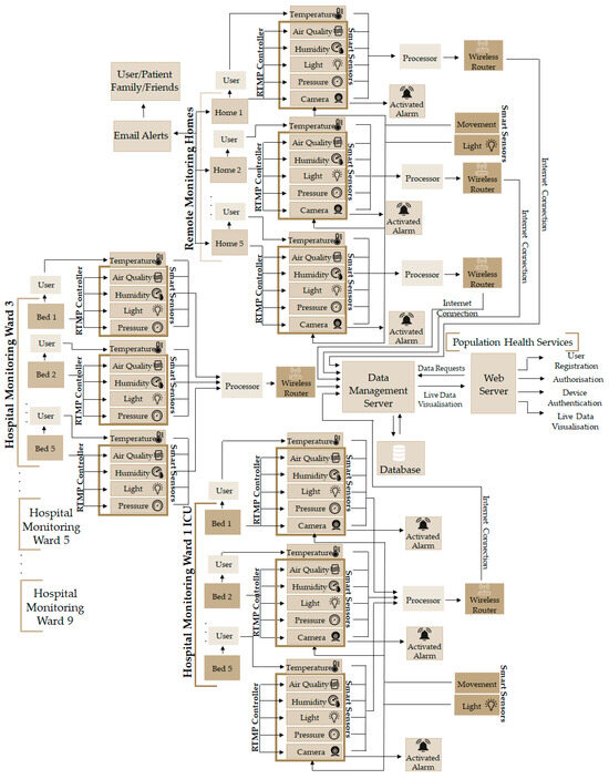 This paper proposes a novel secure and lightweight privacy-safeguarding IoMT system, known as Secure-by-Design Real-Time IoMT Architecture for e-Health Population Monitoring (RTPM). This kind of system is best fit for monitoring well-being in two-fold, i.e., local monitoring (care home, hospital, etc.) and remote monitoring, as shown in Figure 3. The proposed IoMT device can collect diverse sensory information (movement, temperature, humidity, light, pressure, air quality, picture, or video) and display messages with LCDs, buzzers, and LEDs. The proposed RTPM is a secure-by-design solution that protects the data source (IoMT device), securely authenticates every participating IoMT device, safeguards data transmission channel from unauthorised access, ensures non-repudiation, protects data from MAC spoofing, conducts secure key management and authorises every user participating in the system to support auditing and accounting. Thus, the proposed system addresses all the key security issues about data confidentiality, data integrity, and data availability. The proposed system has the following key security and network features: