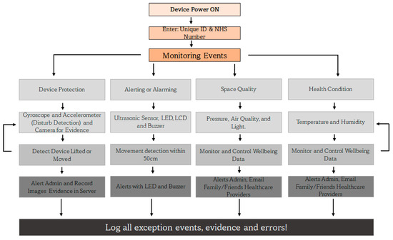 The IoMT device is activated with a unique ID that is supplied during the registration process of the user, and along with the NHS number, the device is uniquely identified by the server. The monitoring events are grouped into four strands, namely device protection, alerting or alarming, space quality, and health condition aspects. Due to the lack of compatible sensors to integrate with the designed system, some health-sensing systems like those for heart rate, ECG, and oxygen level could not be integrated. The system continually monitors the user and their environment, as shown in Figure 5, and it records every event and piece of evidence including errors to monitor issues and identify reasons for failures of the system. The controller monitors the events and activities of all four activity strands and alerts the concerned and relevant stakeholders including the people around the room if they come too close, move the device, or try to steal it. In such an event, evidence is collected in the form of movement detection, snapshots of the environment are captured with the camera, and the evidence is securely transmitted to the server for investigation and service quality monitoring (to find out who touched the device, when and how often, etc.).