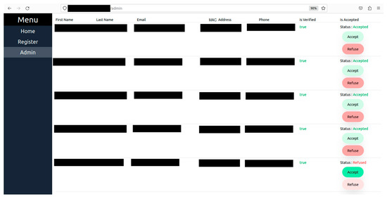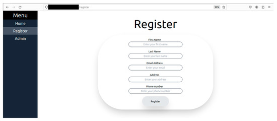 The keys are managed as shown in Figure 6. The client IoMT devices are capable of generating keys. To build and retain confidence and trust among the users who adopt such monitoring technology, the end user’s devices generate their public and private key pair, the public key is shared with the server, and the server does likewise. This does not mean the server cannot generate and distribute keys to the client. It means the user’s trust level will be higher when it generates their key rather than a third party providing it. In this proposed system, every user must register on the web server to receive a unique ID for the IoMT identification and authentication process. Every successful validation of the user registration leads to the creation of three different unique hashed HEX digits using SHA 256, namely verified ID (Υ) = SHA256 (user registration information), unique client ID (∂) = SHA256 (MAC address), and random number (µ) = SHA256 (32 digits), and these data are used for the IoMT identification and authentication during the device connection to the server, as shown in Figure 6. The unique ID used during the device identification = SHA256 (Υ + ∂ + µ), and since its raw data are within the server, it can validate the hash value and authenticate it. Thus, in the first step, user registration along with verification is conducted as shown in Figure 7 and Figure 8, which elaborate on how the authorisation process is conducted to verify the authenticity of the user. Figure 9 shows the connection request made by the IoMT client to the IoMT server and how the signature validation is executed when exchanging the public keys. The IoMT server and the web server are hosted on the same machine. The public keys of the IoMT server and the IoMT devices are exchanged once the client’s connection is established successfully, as shown in steps 2, 3 and 4 of Figure 6. The IoMT server is responsible for creating the session keys for secure data transmission from the IoMT clients. The session key is an AES key and is delivered to the IoMT clients by the IoMT server by securely signing to ensure that the originator’s identity and data integrity (using SHA 256) are maintained, as shown in step 5. The data transmission from the IoMT clients for the session is conducted by using AES 256, which is provided by the IoMT server, and signing the data using SHA 256, as explained in step 6 of Figure 6 where the IoMT client’s private keys = {RSA PrivK-1, RSA PrivK-2, …, RSA PrivK-N} and public keys = {RSA PubK-1, RSA PubK-2, …, RSA PubK-N}. The session key is represented by the AESSession Key, the IoMT server’s private key is RSA PriK-S, and the public key is RSA PubK-S.