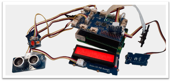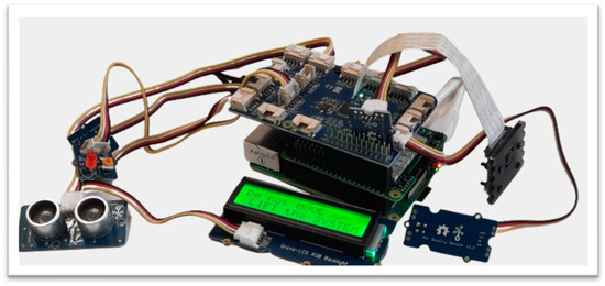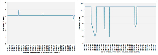 Figure 14 shows the measuring and monitoring of the air quality and the movement of people around the monitoring system. The positive incremental spikes from the normal reading in the air quality show that the air quality was decreased, which happened when five people sat around the IoMT sensor (more released CO2), and the lower reading value of air quality occurring towards the end of the reading shows that the air quality was improved, which was triggered by the opened windows. The distance between the proximity sensor and the wall was measured as 110 cm, and the spikes are the result of introducing a human hand movement towards the proximity sensor at different times.