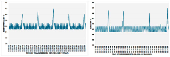 - Visualisation of the Collected Data: The health and well-being environmental data that are collected from IoMT sensors can be viewed by the stakeholders through the IoMT server and web server. The screenshots of the temperature reading and moisture level of the skin when holding the sensors were collected using temperature and humidity sensors, and the results are shown in Figure 13. The spikes in the results are the results of blowing warm air through the mouth, which guarantees proper working of the system. The readings are taken from a snapshot record from 11:51:33 (AM) to 12:58:17 (PM), and the readings are taken every 5 s and updated on the server only when there is a change in the reading value; however, the IoMT client pushes the last recorded data even if there is no change if the time lapse over 5 min to ensure that the connection is live.