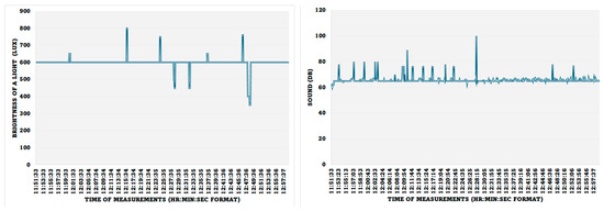 The light and noise levels were measured and recorded, as shown in Figure 15. The reading above 600 Lux is due to the introduction of more lighting around the sensor, and the reading going down is due to the closing of the window curtains. The normal lab sound record is 65 Db, the spikes are due to the noise of the servers running in the lab room, and the higher spikes are due to the introduction of a random human noise.