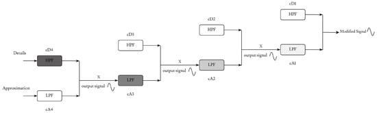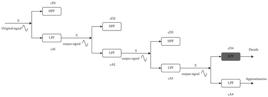 Here, the low-pass filter computes the sum of adjacent elements, while the high-pass filter calculates their difference. The resultant of the high-pass filter produces the detail coefficients (cD), and the post-filtered signal contains residual noise. Passing the signal through a reconstruction high-pass filter produces the signal details (D). On the other hand, the result of the low-pass filter is the approximation coefficients (cA). In these coefficients, the smoothed signal is stored and when passing it through a low-pass reconstruction filter, the approximation of the signal (A) is obtained [21].
