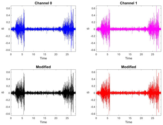 Signal reconstructed of the XC3951Solitario audio recording is shown before modification (top part of the figure) and after modification (bottom part of the figure), separated by channel.