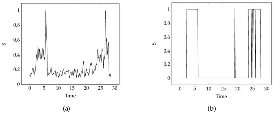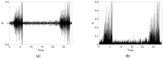 We first obtain the absolute value of the amplitude of the spectrogram as shown in Figure 5. Observing this bird song, we can see that even in the silent period, the sound is present, different from 0, although clearly, the bird is not singing during this time. As such, we have to establish a threshold to digitalize the signal to obtain the lapses of time when the bird is singing or in silence as we show in Figure 6a where we show the analog signal magnified and in Figure 6b we show the digital representation where the On/Off periods are now clearly identified. Note that the digital representation is only used to characterize active and inactive periods, not to digitalize the bird’s song which will be done in a subsequent section.