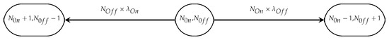 - To state when an inactive node becomes active and . This occurs with rate . As such, the mean time of the node in the Off state is considered to be .