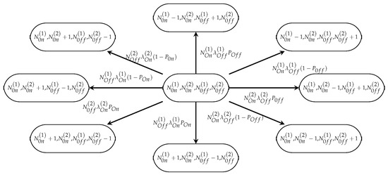 - To state when a node is active in phase 1 and turns off in phase 1 of the Off mode. This occurs with rate of , this is the reason why there is one node less in state On with phase 1 and one more node in the Off mode with phase 1.