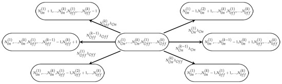 From this, the Markov Chain corresponds to an irreductible chain with valid states where N is the total number of nodes in the system, () is the number of active (inactive) nodes, i.e., nodes in the On (Off) mode. Note that . From state the valid transitions are as follows (See Figure 7, and Table 2):