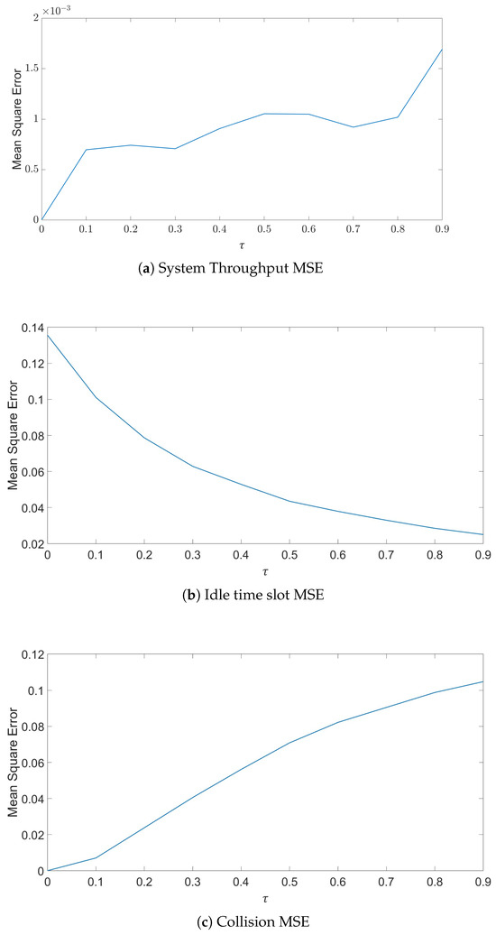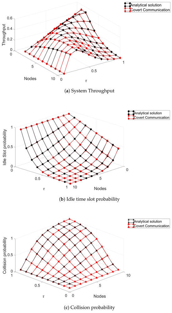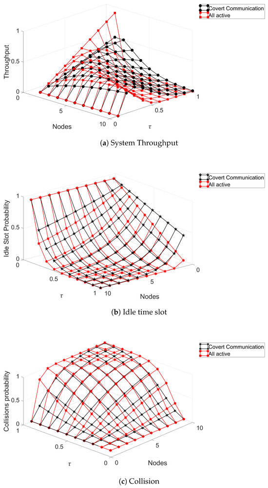 The transmission of data packets is measured using the following teletraffic metrics: throughput (), the probability of having a free slot (), and the probability of packet collisions (). These metrics depend on the probability , which represents the likelihood of a transmission occurring in the current slot, the probability that only one node transmits during the current slot (), and the probability of an idle slot ().