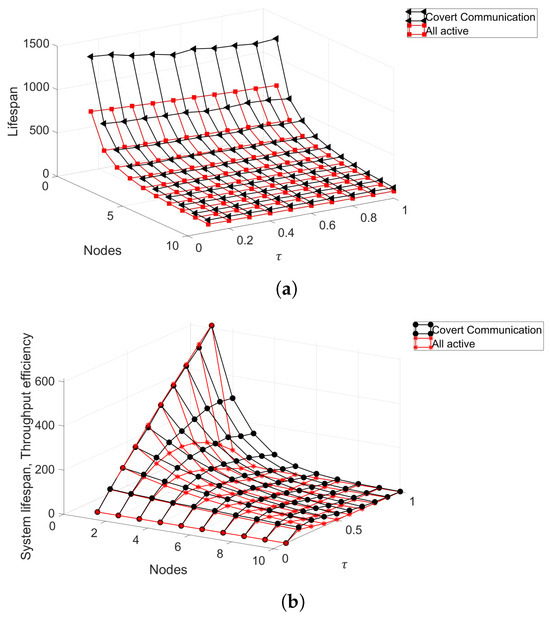 To calculate the system’s lifespan, we determine the total energy available to the system (), the energy consumption of transmitting nodes ( and respectively), the energy consumption of nodes that are turned on but not transmitting (), and the energy consumption of nodes in an idle state ().