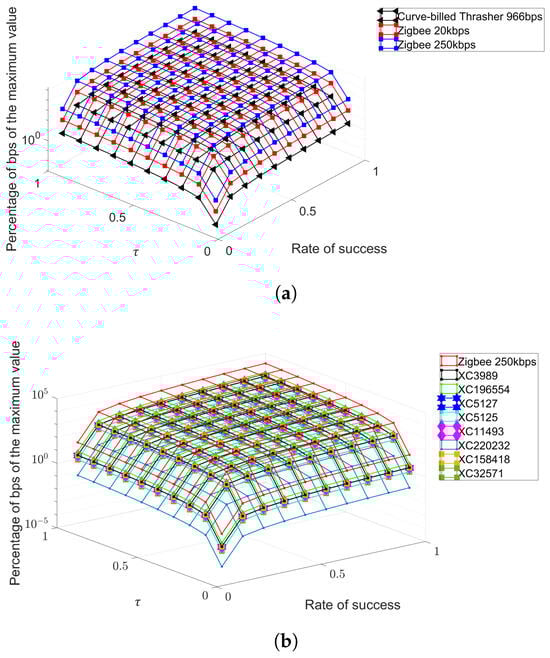 Transmission Rate comparison between modified audios and Zigbee minimum and maximum transition rates. (a) Curve-billed Trasher, and Zigbee minimum and maximum transition rates, (b) Birds’ audios, and Zigbee minimum transition rates.
