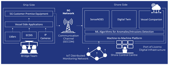 The applications composing the Shore Control Centre are based on the real-time availability of the information coming from the ship to the shore and vice versa, which is exchanged through the 5G private network. In particular, the SCC makes use of port-related data and a snapshot of the seaport area through the high-definition monitoring network (10 cameras) and the data coming from the sensor network of the Port of Livorno (bathymetric probes, weather stations, anemometers, current meters, wave meters, noise, and environmental sensors). Moreover, the SCC can exploit the information coming from the shipboard as well as from the sensors installed on board (e.g., cameras and Light Detection and Ranging sensors—LIDARs). The exact positioning of the ship (in the order of 10 cm) is guaranteed by the presence of a Real-Time Kinematics (RTK) network.