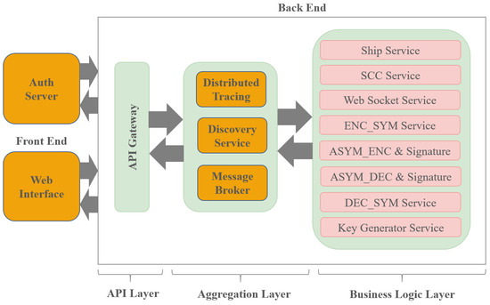 Due to the complexity of maritime networks, in addition to a secure communication protocol capability between the ship and SCC, there is a need for a framework that can properly address scalability as well as fault-tolerance-related aspects. Hence, the SECOM standard is implemented relying on a microservice architecture (namely MSA-based SECOM). The MSA-based SECOM is deployed on the SCC, and it comprises different microservices, as shown in Figure 3. Some are employed for non-functional requirements, such as the API Gateway, the discovery server, the authentication and authorisation server, the distributed tracing mechanism, and the message broker. Then, there is a suite of microservices that are required to implement the SECOM functionalities, such as the symmetric encryption and symmetric decryption, the asymmetric encryption and signature, the asymmetric decryption and signature verification, the key generator, and WebSocket. The main purpose of the SECOM standard is to enable the exchange of information that is consistent with the S-100 data model from the ship to the SCC and vice versa in such a way that the security requirements are fulfilled.