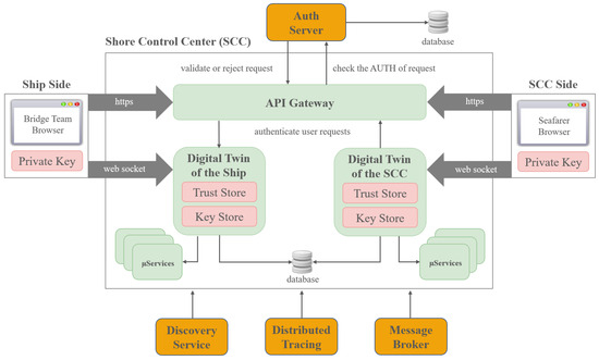 As shown in Figure 4, the SECOM system architecture has three main blocks: the ship side, the MSA-based SECOM suite, and the SCC side. On the ship side, users are connected through a browser and can exploit the functionalities provided by the ship-side microservices. They are provided with a digital certificate and a private key to encrypt messages to be sent to the shore. The SCC operator also has his own certificate and a private key and can send encrypted messages to the ship side.