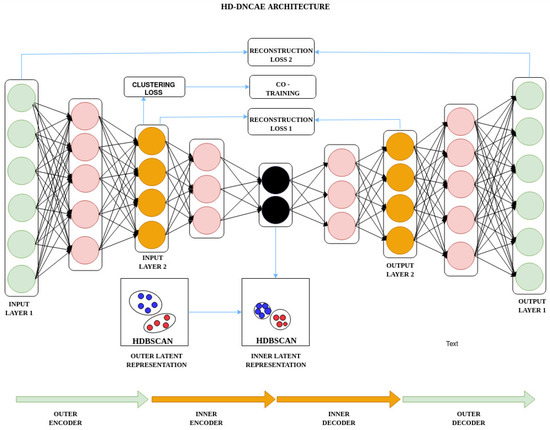 Figure 5 shows the architectural view of the HD-DNCAE, which consists of the outer encoder, inner encoder, inner decoder, and outer decoder. The architecture also contains some functions that perform specific tasks such as calculating the clustering loss, calculating reconstruction loss for both the inner and outer deep autoencoders, and a co-training function.