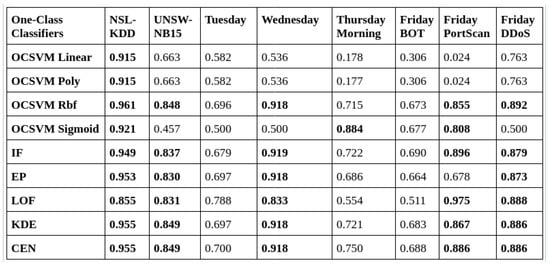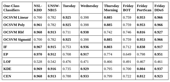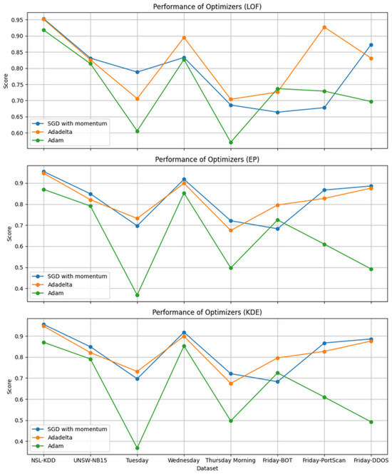 Various optimisers such as Stochastic Gradient Descent (SGD) with momentum, Adaptive Delta (Adadelta),and Adaptive Moment Estimation (Adam) were tested and their AUC Scores were compared. The results showed that SGD with momentum and Adadelta performed better, as shown in Figure 7. We updated the weights and biases of our deep neural network (HD-DNCAE) by using each of the chosen optimisers. The HD-DNCAE was trained to learn the information and meaningful representations in the latent layers of normal data fed into the neural network. Then, the model was used to train a simple One-Class Classifier, such as a Support Vector Machine (SVM), with a variety of kernels (Linear, Poly, RBF, and Sigmoid). Furthermore, we trained using Isolation Forest (IF), Local Outlier Factor (LOF), Elliptic Envelope (EP), Centroid (CEN), and Kernel Density Estimation (KDE). These classifiers were chosen based on the work performed by [3].