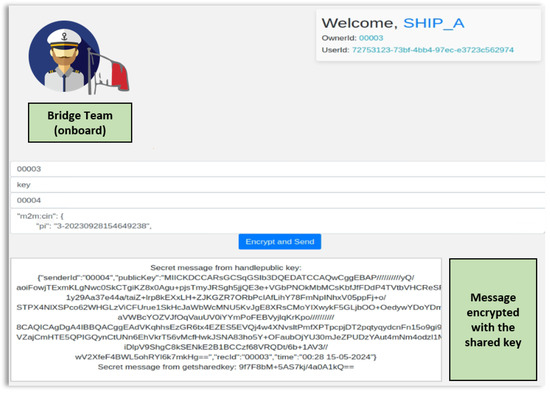 After spinning all the containers using Docker-compose commands, SECOM can be used as a secure infrastructure by the users (from the ship and ashore). Both end users (the bridge team and the seafarers) bootstrap the application and are redirected to the Keycloak login page for authentication. Assuming each user has been authenticated successfully, they are provided with an ID and an access token so that they can use every microservice. After that, users are redirected to the home page of the application. From this point on, each user can establish a shared key when they want to send a message to the other side. In our case, the bridge team wants to send a sample vessel routing plan to the seafarers, as can be seen in Figure 8 and Figure 9.