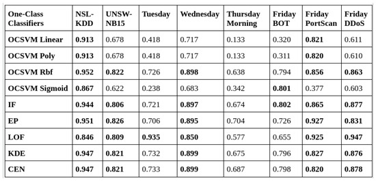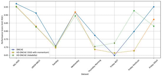 Furthermore, this paper introduced HD-DNCAE, an enhancement to the DNCAE model, implemented with SGD momentum and Adadelta optimisers. We repeated the experiments across multiple datasets to demonstrate HD-DNCAE’s performance in anomaly detection tasks. On the NSL-KDD dataset [40], HD-DNCAE (SGD momentum) with KDE and CEN classifiers achieved an AUC of 0.955, as with DNCAE’s performance. For the UNSW-NB15 dataset [41], HD-DNCAE (SGD momentum) with LOF reached 0.831 AUC, outperforming DNCAE’s 0.542. Moreover, HD-DNCAE showed improvements in several CIC-IDS [42] scenarios: