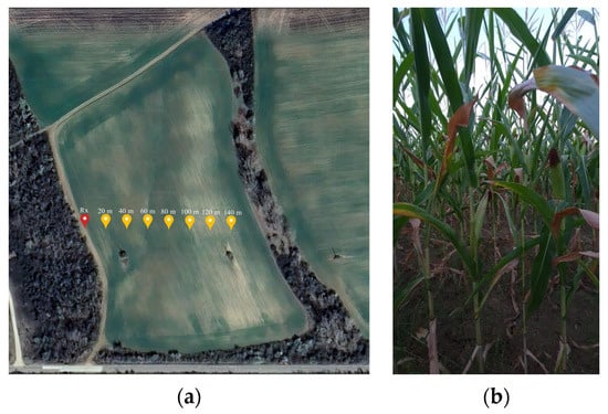 Measurements in a corn field in the agricultural area near Dabravata Village, Yablanitsa Municipality, Bulgaria: (a) Google Earth image; (b) photo from the corn field.