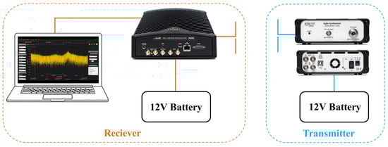 Figure 2 shows the configuration of the measurement setup consisting of a portable RF signal generator (AS108, Pico Technology, Tyler, TX, USA, frequency range 300 kHz–8 GHz) directly connected to a reference dipole. The RF generator was configured to generate a continuous wave (CW) signal with a frequency of 0.9 GHz or 2.4 GHz and a power level of 0 dBm. The generator and the antenna were positioned in the corn field and relocated, as illustrated in Figure 3a,d. The transmitted CW signal was captured by a real-time spectrum analyzer (R5550-427, thinkRF, Ottawa, ON, Canada, frequency range 9 kHz–27 GHz) using a reference dipole antenna and stored on a laptop connected to the analyzer through an Ethernet interface for post-processing. The spectral analyzer and antenna were located outside the cornfield, as shown in Figure 3b. The coordinates of the receiving antenna are 43°05′19″ N 24°02′17″ E.