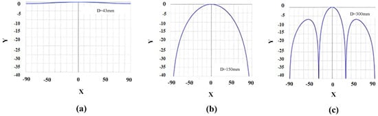 (a) Radiation pattern with antenna spacing d = 43 mm. (b) Radiation pattern with antenna spacing d = 150 mm. (c) Radiation pattern with antenna spacing d = 300 mm.