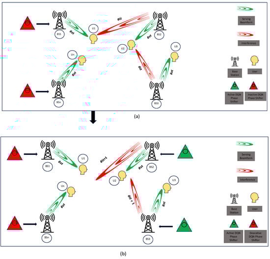 The proposed DQN-based 5G beamforming architecture: (a) Beamforming and interference in a traditional 5G network without DQN control, (b) Proposed DQN-based 5G beamforming with interference angle steering.