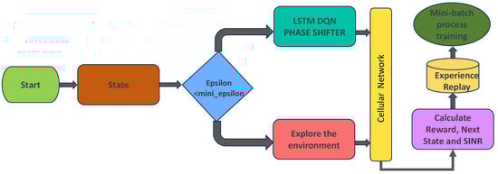 In this paper, we introduce our DQN-based deep reinforcement learning, which can control the phase shifter to reduce the slide lobe interference. In our case, the phase shifter is called a DQN agent, which is responsible for taking the best action from a state in our cellular OFDM-based environment. The DQN phase shifter’s objective is to steer the interference angle, which is associated with reducing the interference power and enhancing the SINR. In our work, the state, , is organized with different information such as coordinates of users, coordinates of the base station, angle of the signal, serving power, and interference power from a particular base station for the user. The proposed DQN phase shifter can choose only one action among two possible actions, such as left shift angle and right shift angle. According to the concept of time delay in beam steering (if the time delay increases the phase moves to the left and, otherwise, the phase shifts to the right), we assume that if the served user is in the right direction from the interference signal the phase shift goes in the right direction; otherwise, it goes in the left direction. Therefore, the DQN phase shifter can either decrease the time delay or increase the time delay. We select the value of shift at 0.001 s, similar to [1] for either decreasing or increasing time delay. For each period of phase shifting, the interference signal loses some power, and the server signal’s strength can be increased. Initially, the agent explores the environment by taking random actions because the agent does not know anything about the environment. After exploring, the agent exploits the environment by taking action from the neural network model. This method is called the epsilon-greedy technique.
