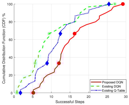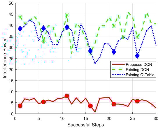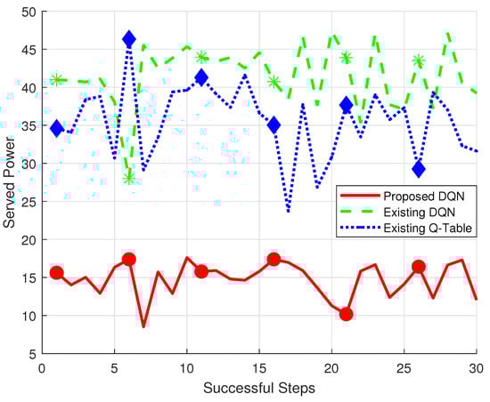 Signal to interference plus noise ratio (SINR) is an essential metric that represents how well the signal quality is received by a receiver. It indicates how strong the desired signal is compared to the combined effect of interference and noise. A higher SINR typically indicates better signal quality and consequently better communication performance. In our proposed DQN-based method, the SINR at each successful step is higher than in other existing work [1]. Higher SINR indicates better quality of service and communication. The proposed DQN (blue line) in Figure 6 is constantly higher than the other two existing methods [1]. This is also an indication that our SINR achieved through the proposed method provides better quality of service (QoS).