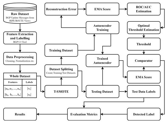 As shown in Figure 2, the proposed EMA model, in combination with Autoencoder, is applicable in detecting anomalies in BGP update messages by proposing duplicate announcements as the main implication. We have collected and prepared BGP datasets from RIPE and Route Views, which contain the network prefixes and routing information for in and around various anomaly events, such as the Slammer Worm Stuxnet worm, Helsinki blackouts, and WannaCrypt ransomware attack. In the preprocessing stage, data cleaning, normalization, and feature extraction are carried out, resulting in 37 features extracted that are divided into volume-based (e.g., no. of announcements, no of withdrawals, etc.) and AS-path-based metrics (e.g., edit distance, AS-path length, etc.). Connect the input and output through a T-SMOTE (Temporal-oriented Synthetic Minority Over Sampling Technique) to balance the training data (Synthetic Minority Over-Sampling Technique). Smoothing the time-series data and identifying trends containing abnormal behavior is performed using the Exponential Moving Average (EMA).