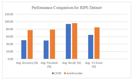 In general, Figure 13, Figure 14, Figure 15, Figure 16 and Figure 17 indicate that on all tests, the Autoencoder is superior to LSTM in terms of anomaly detection, as evidenced by the higher AUC and better classification performance for all tested anomalies. This reinforces the method’s capability to be used for real-time purposes in BGP anomaly detection, which achieves high sensitivity to threats while lowering the false alarm rate.