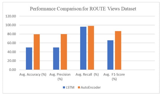 In contrast to LSTM, where temporal dependencies are leveraged, the Autoencoder rather conducts a compact representation of normal BGP behavior, making it resilient to unseen traffic anomalies and fluctuations in the routing updates. In contrast to LSTM, which suffers when faced with rare and diverse BGP attack patterns, its reconstruction error mechanism also binds well to the ability to detect the outlier without needing labeled data. Moreover, the autoencoder is less sensitive to noise and generalizes better for varied anomaly situations, consequently reducing false positives and false negatives. The experimental results reinforce this advantage since the approaches can achieve a higher level of precision (higher than L = 96.79% for Moscow Blackout) and recall (higher than L = 98.31% for Route Views) in comparison to LSTM.