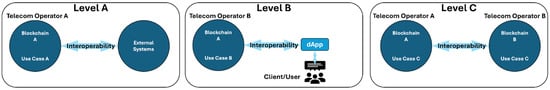 Most research into blockchain use cases in future telecom technologies focuses on deploying a single blockchain and its interoperability with internal applications through decentralized applications (dApps). According to Ren et al. [6], blockchain interoperability operates at three distinct levels: