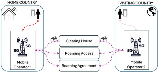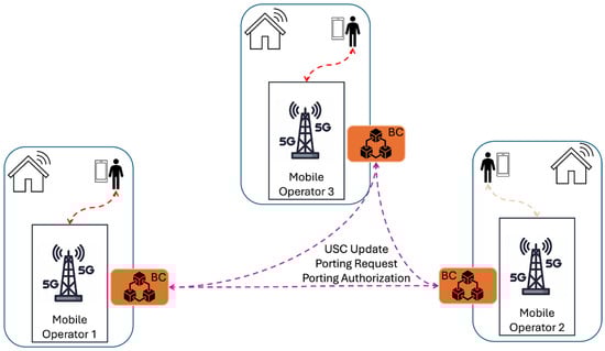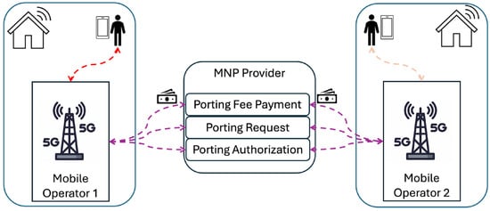 Mobile number portability (MNP) is primarily deployed through intermediaries, such as roaming. In existing 5G and previous-generation networks, a clearing house is an intermediary in each country, where MNP is deployed as a semi-automated or fully automated process. Once regulatory requirements have been established, such a process can be efficiently designed using smart contracts as a self-executing autonomous process. Blockchain can easily facilitate number portability by enabling the secure and efficient transfer of phone numbers between different telecom operators using smart contracts and distributed immutable ledgers provided by blockchain technologies. With the addition of interoperability features, blockchain networks can ensure seamless porting processes while maintaining data integrity and security. In [32], Krishnaswamy et al. offered an MNP solution using a permissioned private blockchain based on Hyperledger and smart contracts. According to [32], automated, immutable processes with smart contracts increase trust, reduce the MNP processing time, and eliminate processing errors through a transparent, fully automated, and distributed process. The traditional mobile number portability process is illustrated in Figure 4.