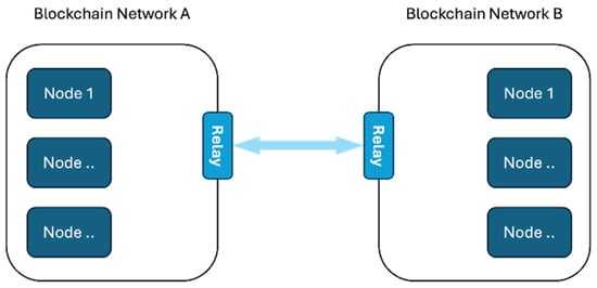 Blockchain interoperability is a popular topic in supply chain tracking. A pivotal survey by Bellavista et al. [45] examined interoperable blockchains in collaborative manufacturing, which are integral to supply chains. They acknowledged that interoperability remains challenging despite numerous solutions, primarily due to ongoing security concerns. The authors concluded that the design of an interoperability solution must meet high-security expectations. In their survey, Bellavista et al. discussed a security solution called a trusted execution environment (TEE). Using this solution, Bellavista et al. proposed a relay scheme architecture in which information is passed through a relay layer, as shown in Figure 6. The TEE solution is designed to eliminate intermediary architectures and modules, facilitating interoperability between two distinct blockchains through a direct connection established by the relay component of each blockchain network. Such a TEE deployment with a relay architecture is feasible for two interoperated blockchains; however, the implementation can become complex if the end-to-end enterprise flow involves more than two blockchains. This could offer security and access rights to all interoperated blockchains but may quickly introduce access policy concerns and conflicts with independently operating blockchains. This is an evident concern regarding tamper-proof security and the strict access policy requirements in the telecom domain.